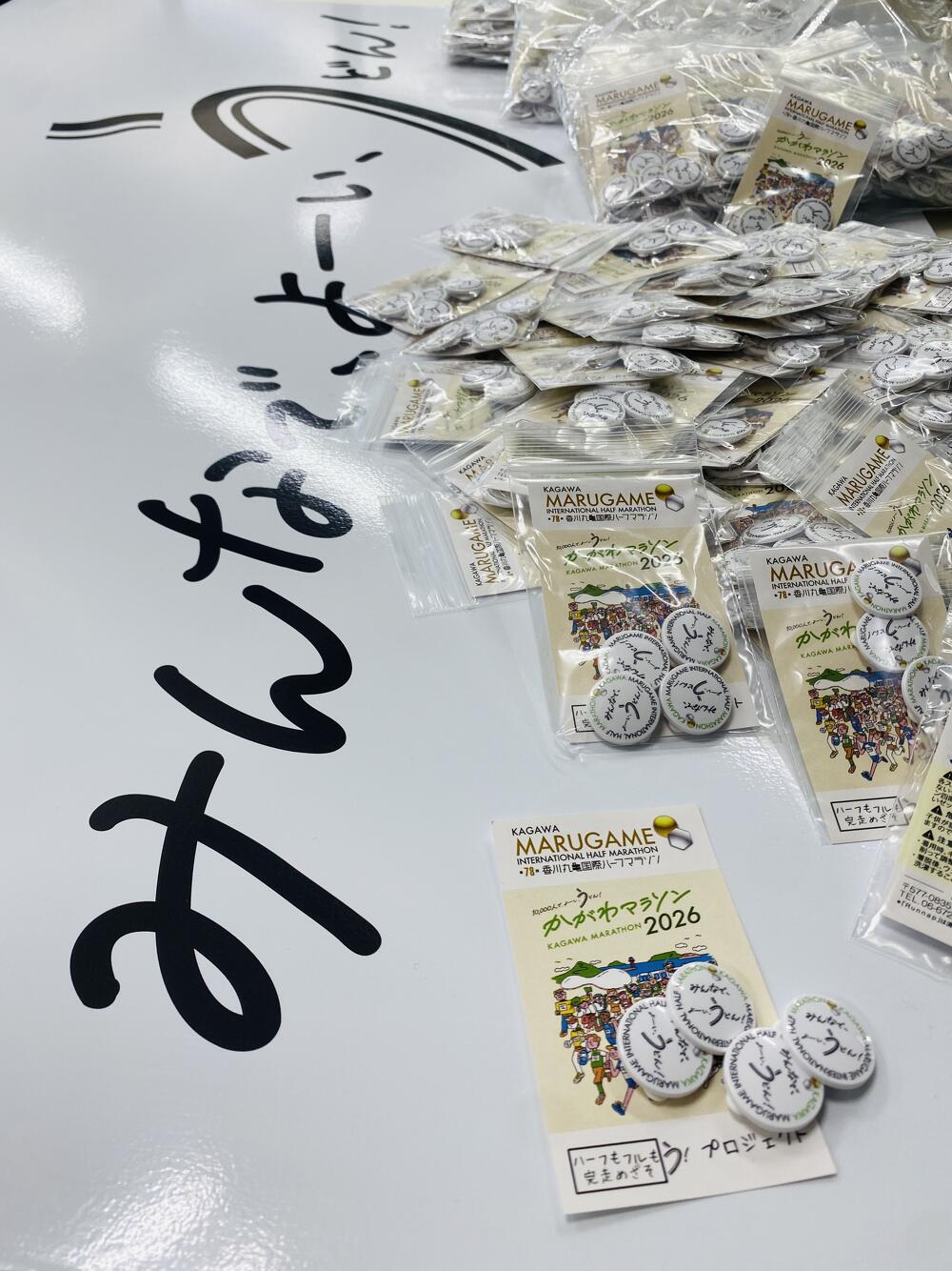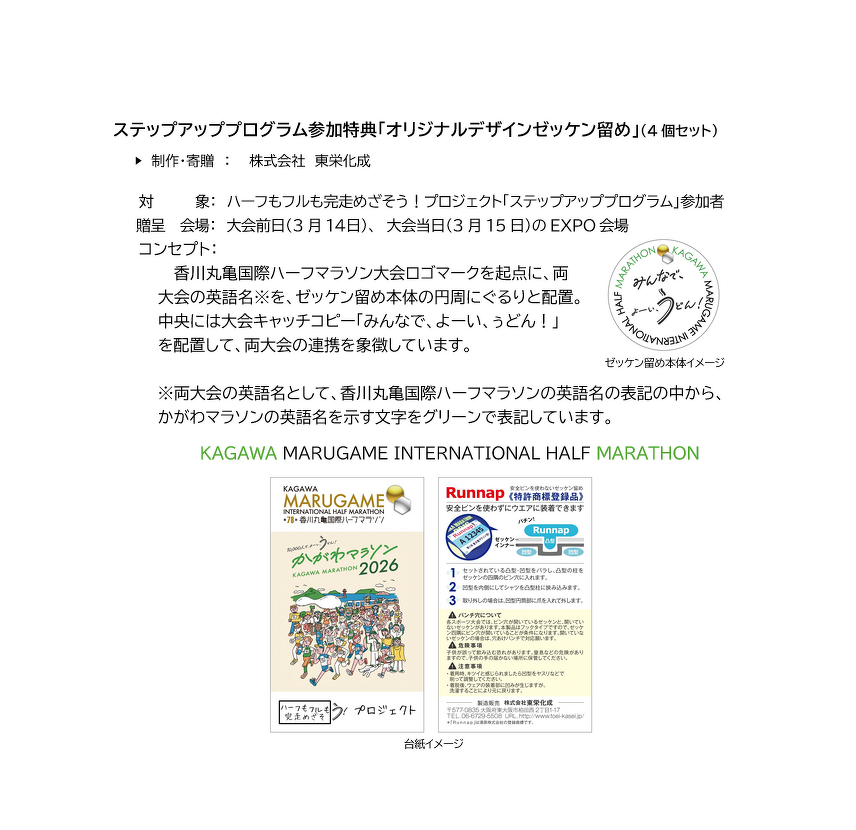 「ハーフもフルも完走めざそう!プロジェクト」のひとつ、ステップアッププログラムでは、各関係団体主催のランニングイベントに参加して、みんなで走力のステップアップを目指す取り組みで、香川丸亀国際ハーフマラソン、かがわマラソンへの出走や完走を目指す、Step1~3のプログラムです。Step1の3つのランニングイベントのうち、どれか1つ以上に参加した方で、ハーフ( Step2 )とフル( Step3 )両大会の会場にご来場(出走または観戦)いただいた方には、参加記念品としてゼッケン留めを贈呈します(制作・寄贈:㈱東栄化成)。