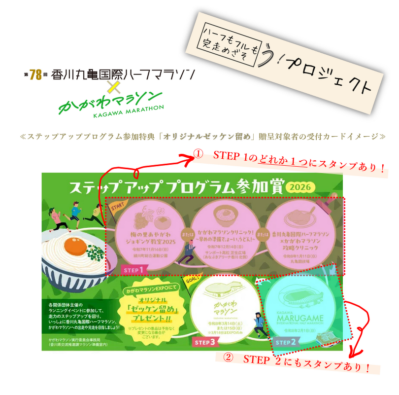ステップアッププログラム受付カードStep1のどれか1つ、およびStep2に受付スタンプが押されている方は、かがわマラソンEXPO2026会場ゼッケン留め引換所にてカードをご提示いただくと、参加記念品ゼッケン留めを贈呈します。