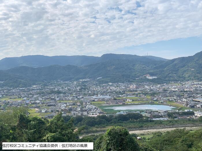香東川沿いから県道176号(産業道路)を往復する区間に面した「弦打地区」は郷東町・鶴市町・飯田町の3町からなり、豊かな自然環境に恵まれたまちです。東には石清尾山・浄願寺山、西には五色台を望み、その間を香東川・本津川の清流が帯のように流れています。「弦打」の名前の由来は、弓を張った形をしている浄願寺山の別名「弦打山」からということです。(弦打地区コミュニティ協議会資料より)