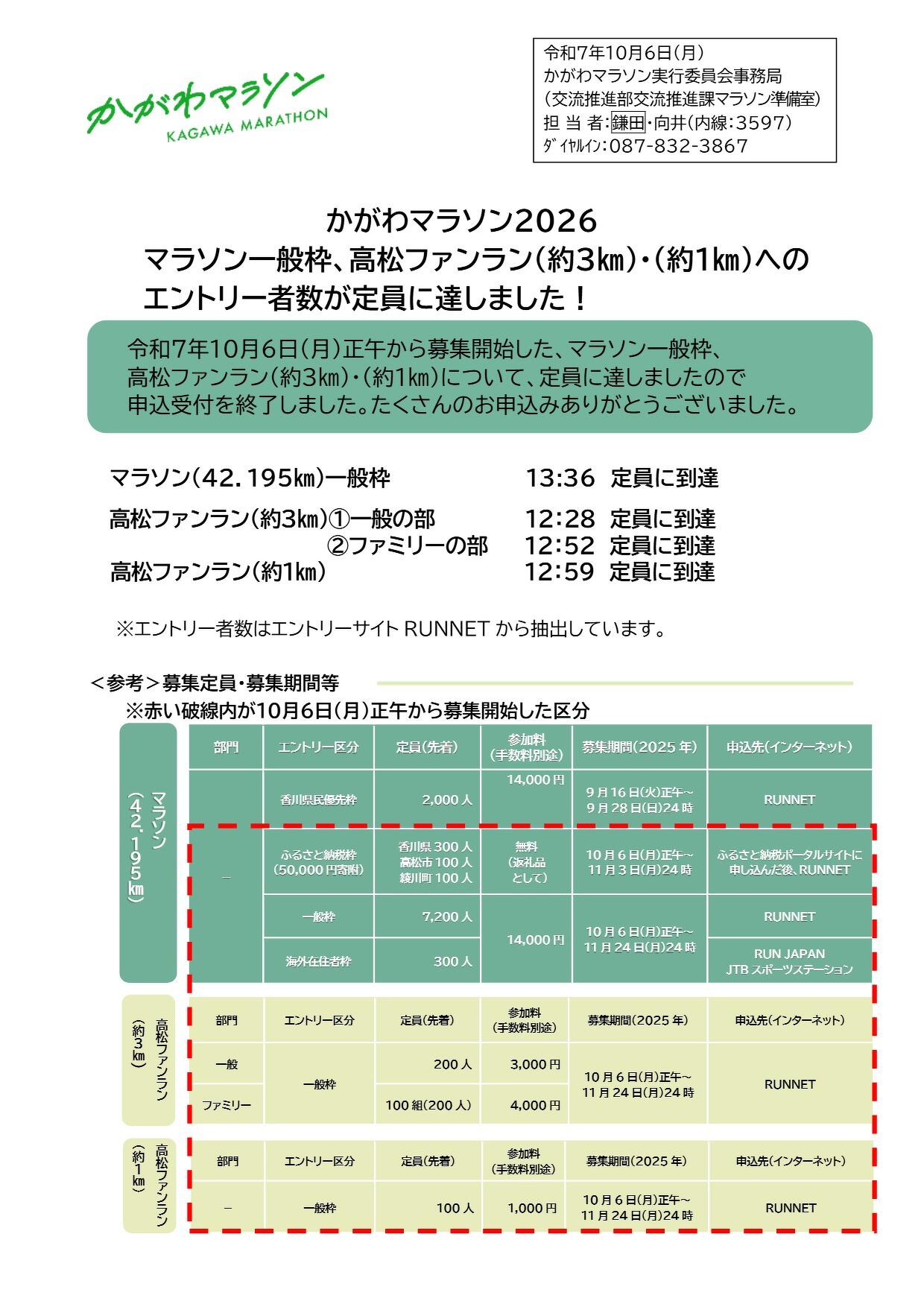 令和7年10月6日(月曜日)正午から募集開始した、マラソン一般枠、高松ファンラン(約3km・約1km)について、定員に達しましたので申込受付を終了しました。