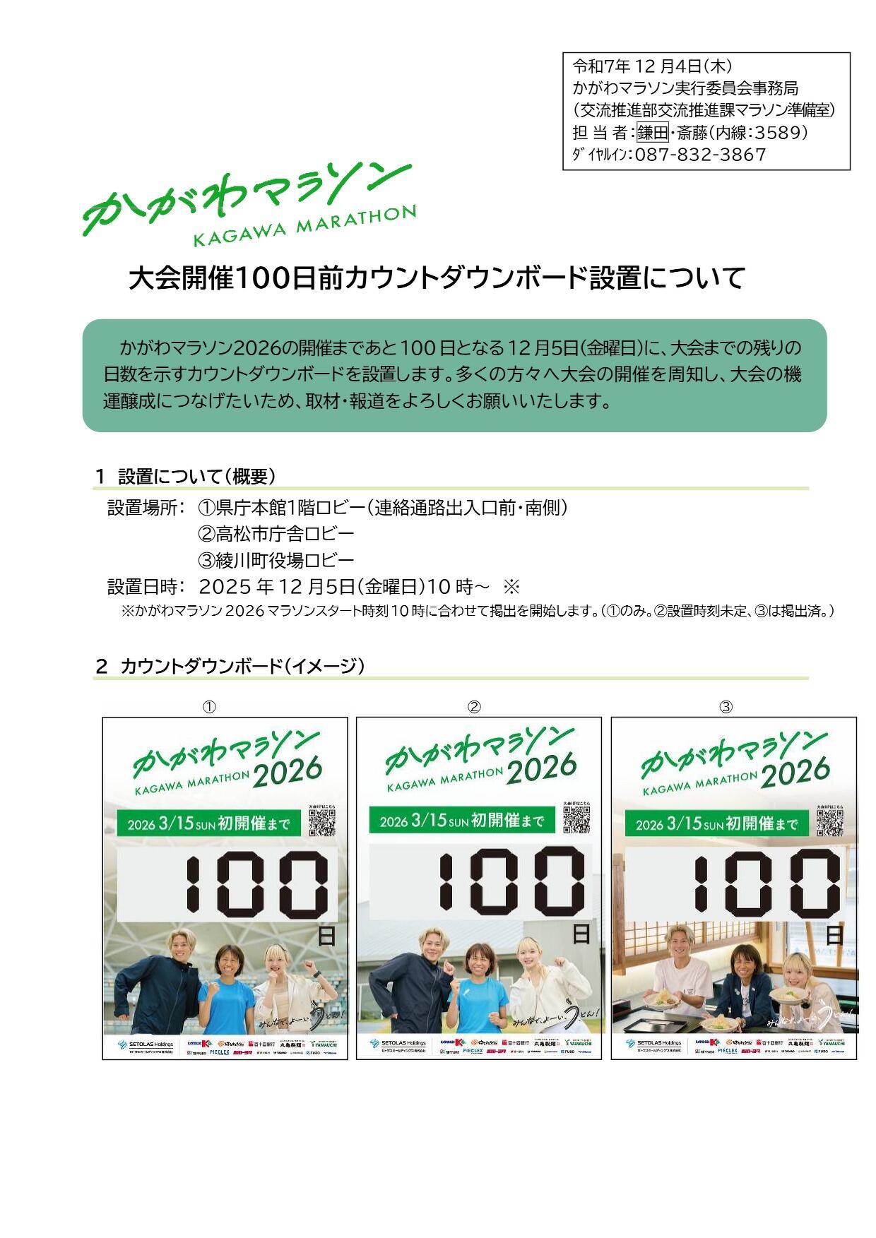公式ウェブサイト上のカウンターではかがわマラソン2026スタート時刻までの残り時間(毎日10時に日数が変わります)、今回設置のカウントダウンボードでは開催日までの残りの日数(毎日0時に更新)をカウントしています。そのため、大会100日前となる12月5日には午前10時以降は終日、公式ウェブサイト上のカウンターでは「開催まで99Days・・・」、カウントダウンボードでは「開催まで100日」と表示されます。