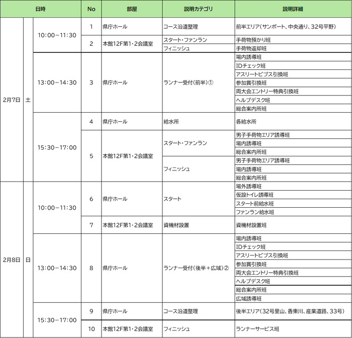 コース沿道整理とランナー受付については、前半と後半がありますが、同内容ですので、指定の時間へのご参加が難しい場合は別日にご参加いただくことが可能です。