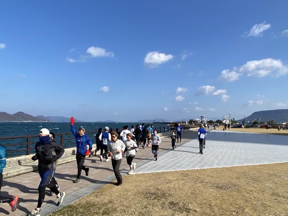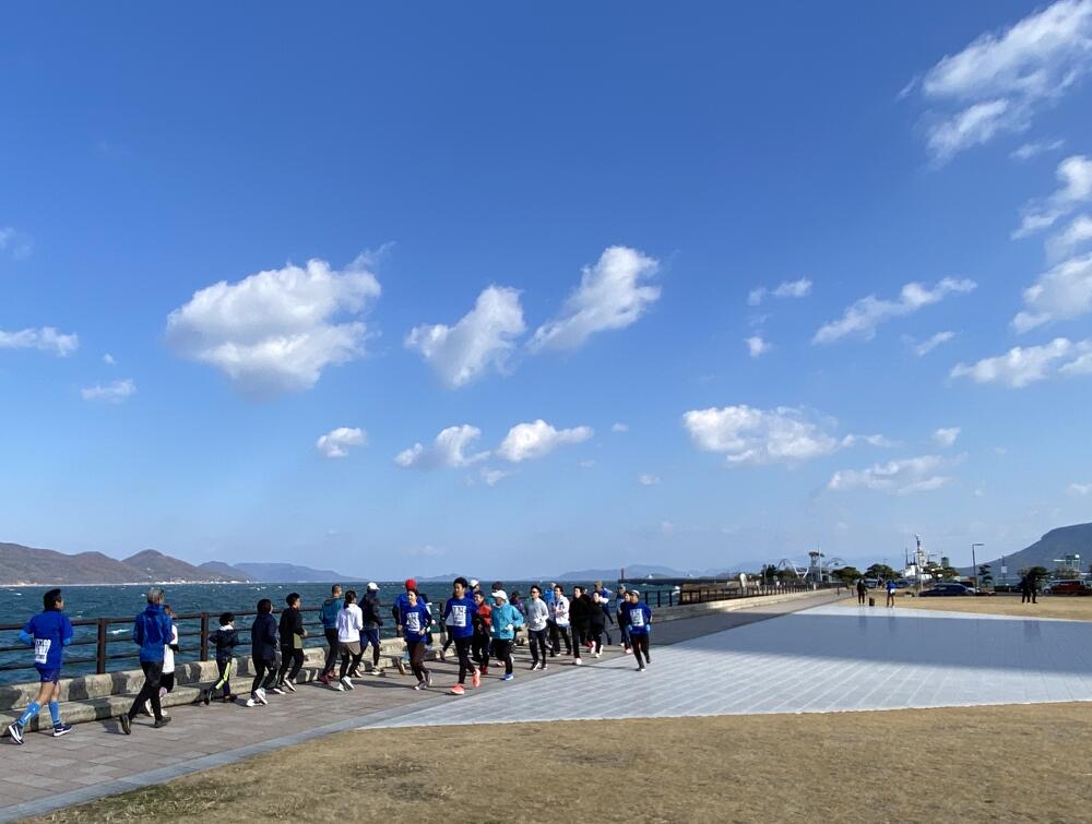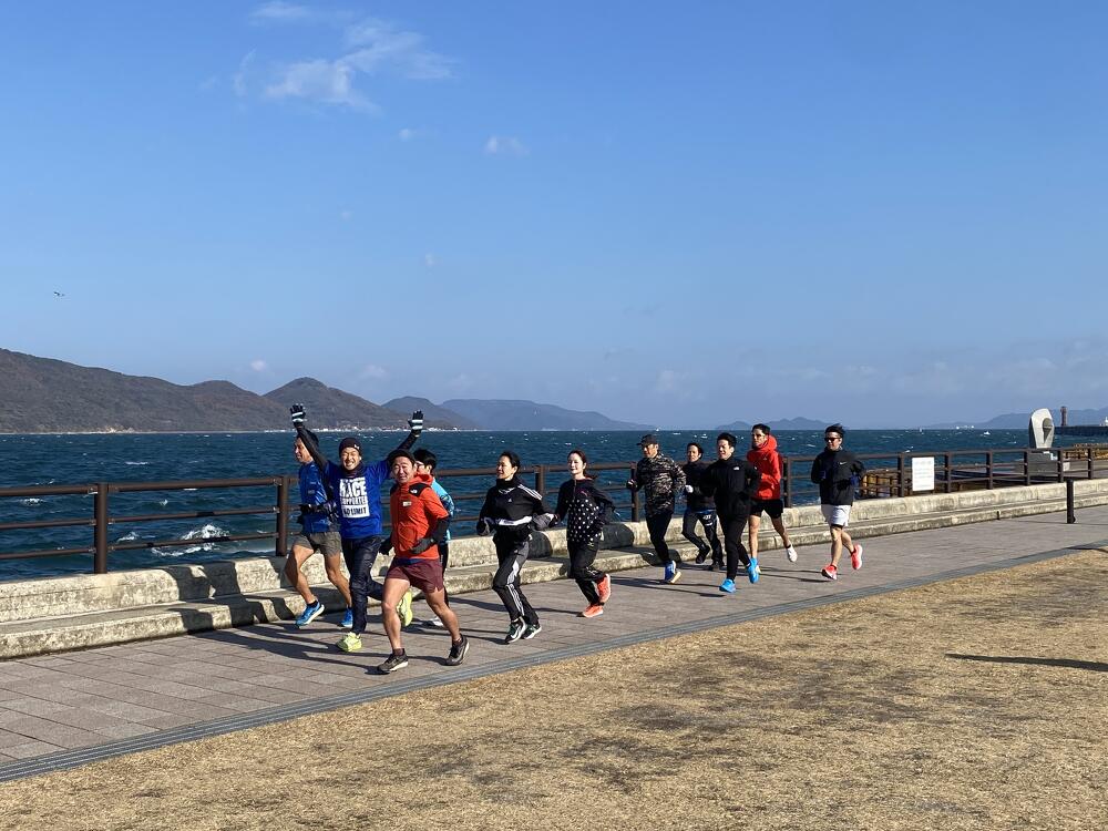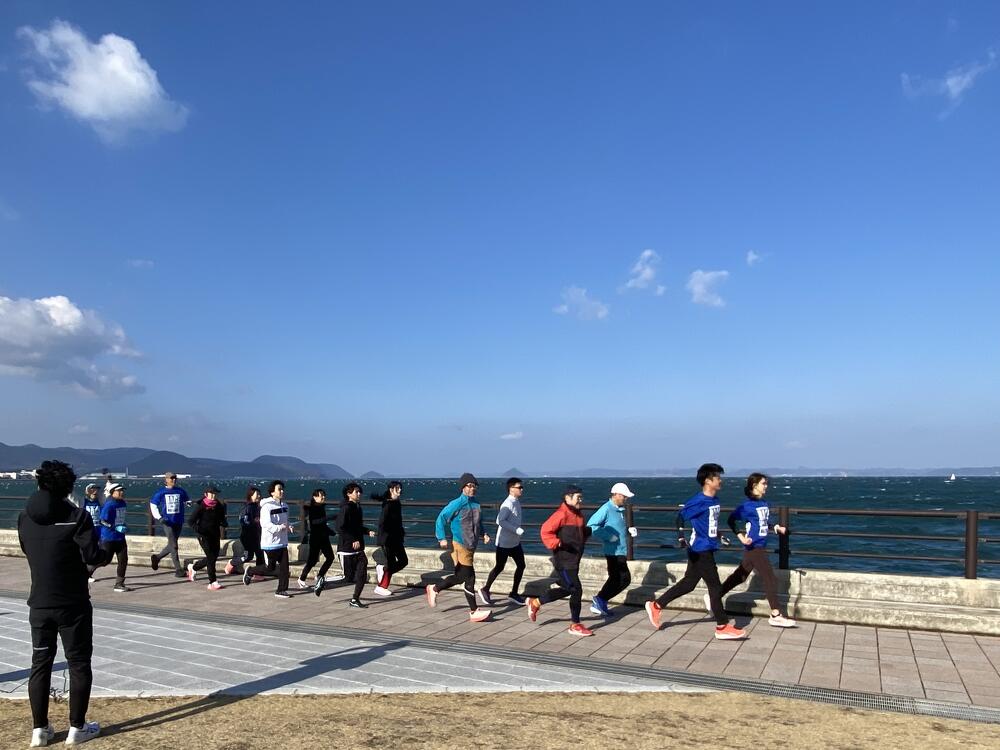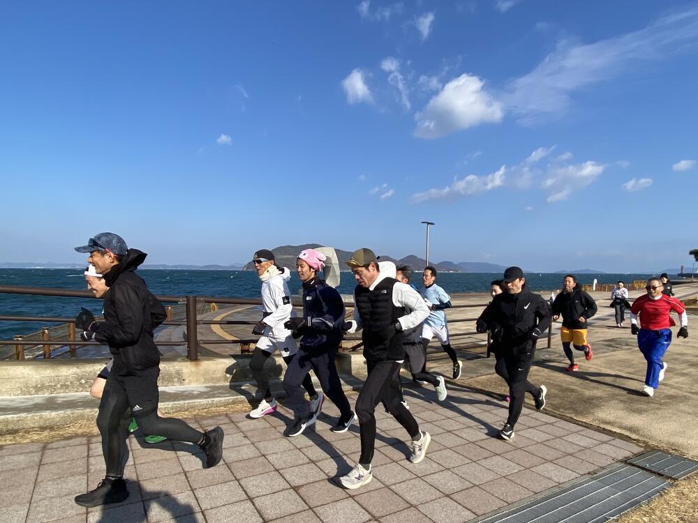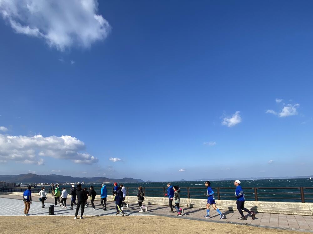 当日の高松市内の風速は約5m/秒。その強風にも寒さにも波しぶきにもめげずに、アリーナ前の海沿いをひたむきに走る参加者のみなさまの姿がとても印象的でした。立っているだけで体がよろめくような強風でしたが、来年3月15日の大会当日も、春一番が吹く可能性も無きにしも非ず。春一番の向かい風の中でも走りきるシミュレーションにはもってこい!?な天候のもと、参加者のみなさんの走力も確実にアップしたはず!と思える、とても充実した練習会となりました。