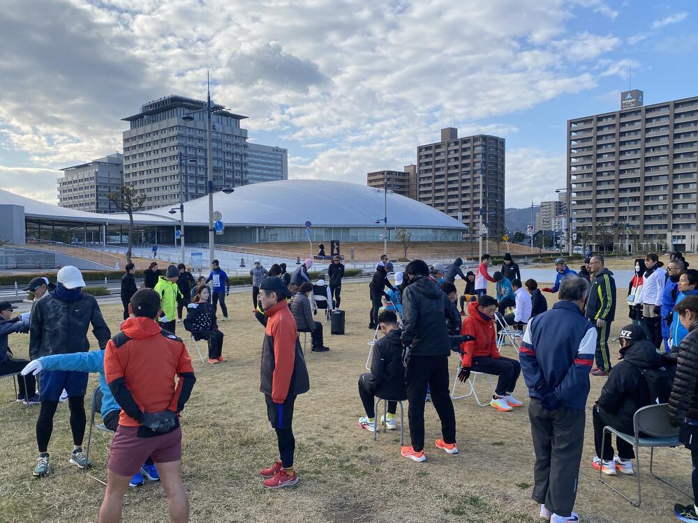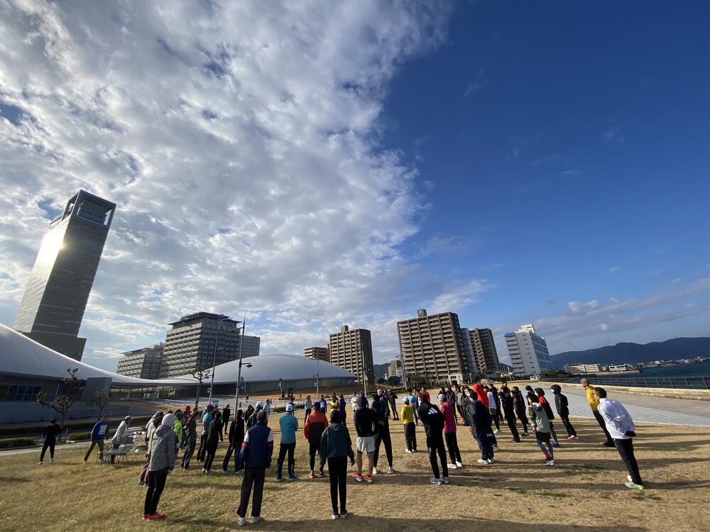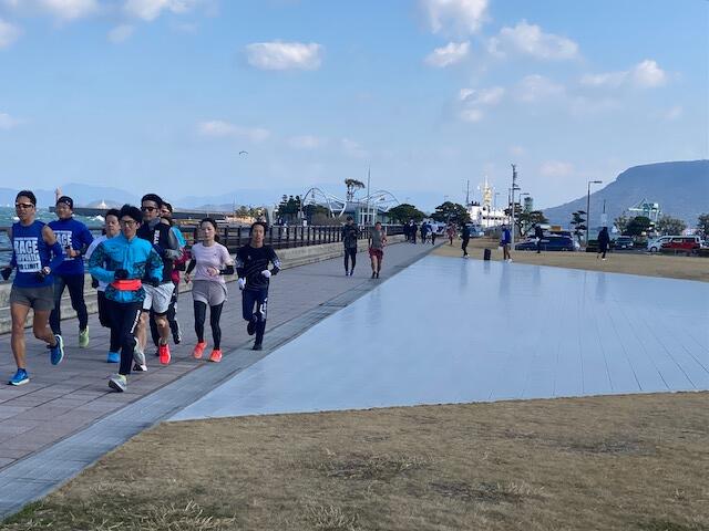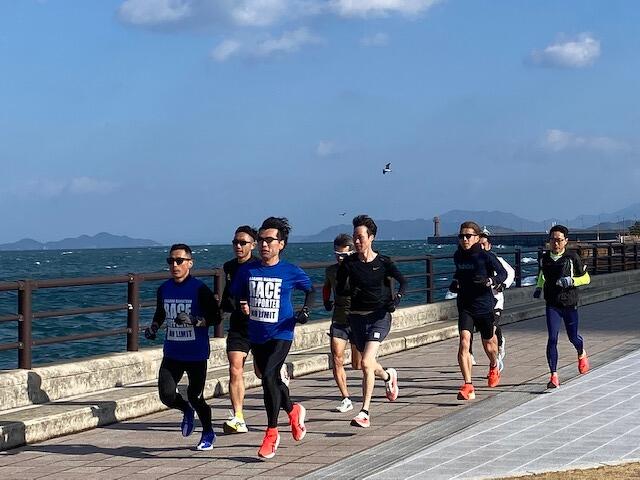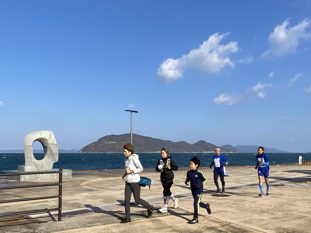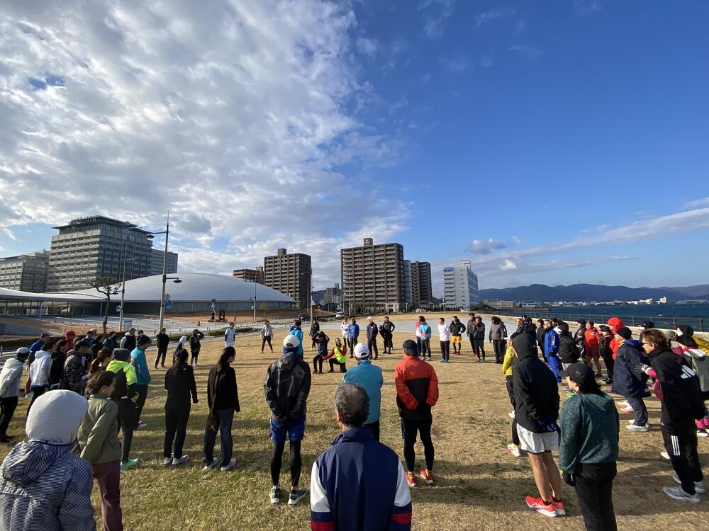 当日の高松市内の風速は約5m/秒。その強風にも寒さにも波しぶきにもめげずに、アリーナ前の海沿いをひたむきに走る参加者のみなさまの姿がとても印象的でした。立っているだけで体がよろめくような強風でしたが、来年3月15日の大会当日も、春一番が吹く可能性も無きにしも非ず。春一番の向かい風の中でも走りきるシミュレーションにはもってこい!?な天候のもと、参加者のみなさんの走力も確実にアップしたはず!と思える、とても充実した練習会となりました。