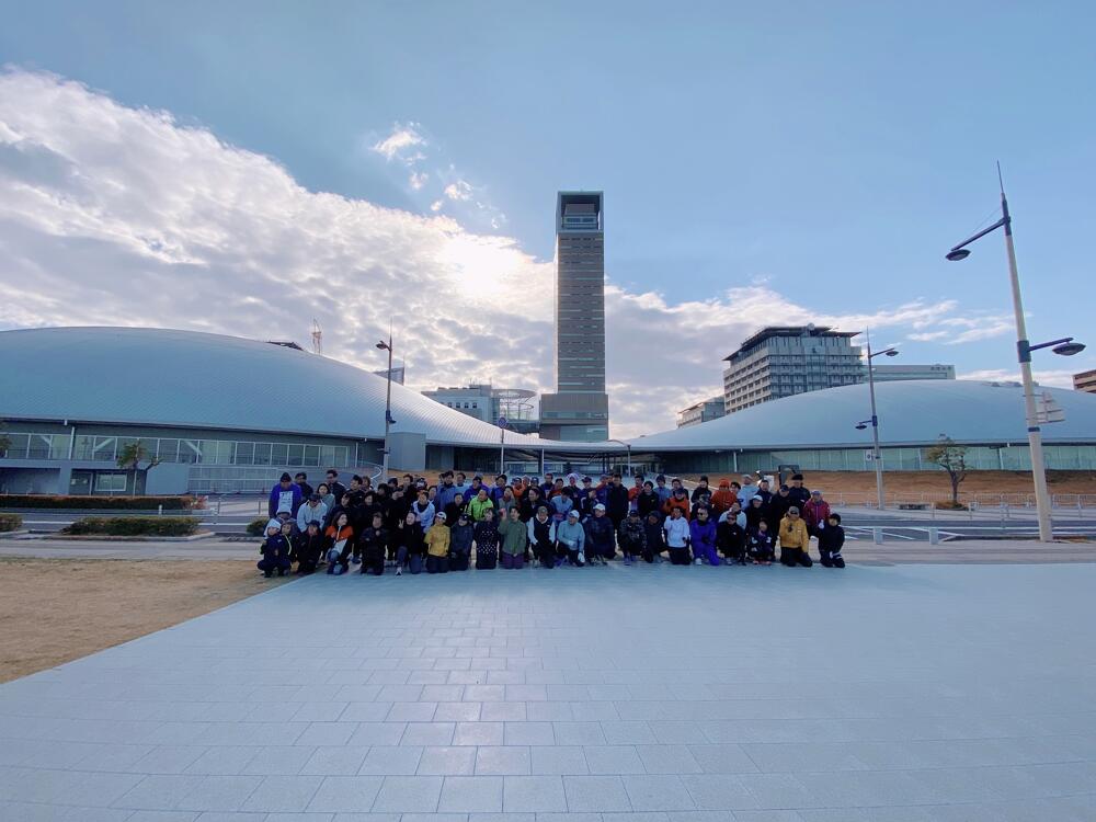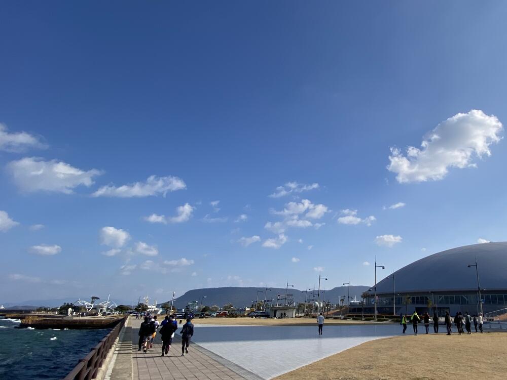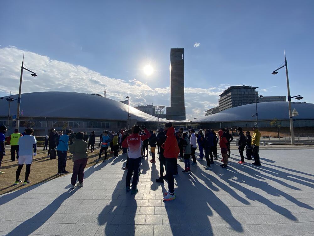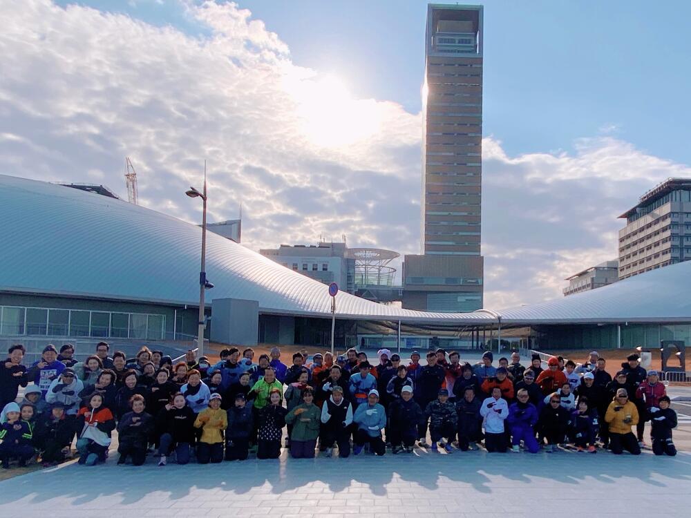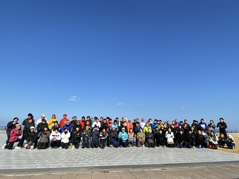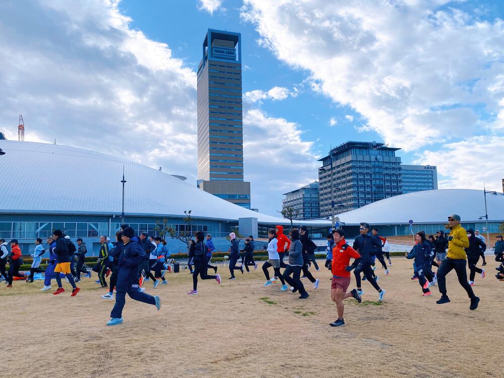 当日の高松市内の風速は約5m/秒。その強風にも寒さにも波しぶきにもめげずに、アリーナ前の海沿いをひたむきに走る参加者のみなさまの姿がとても印象的でした。立っているだけで体がよろめくような強風でしたが、来年3月15日の大会当日も、春一番が吹く可能性も無きにしも非ず。春一番の向かい風の中でも走りきるシミュレーションにはもってこい!?な天候のもと、参加者のみなさんの走力も確実にアップしたはず!と思える、とても充実した練習会となりました。