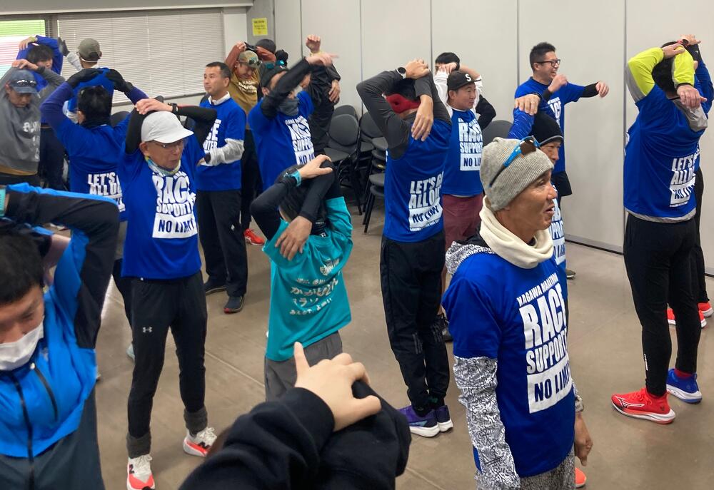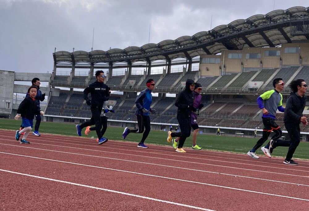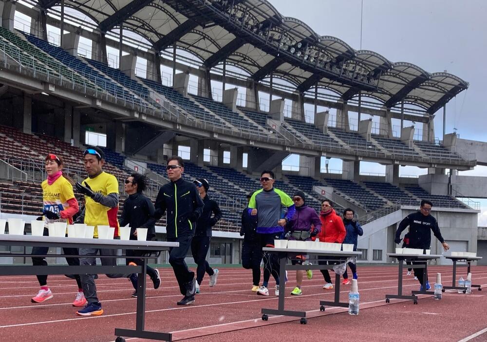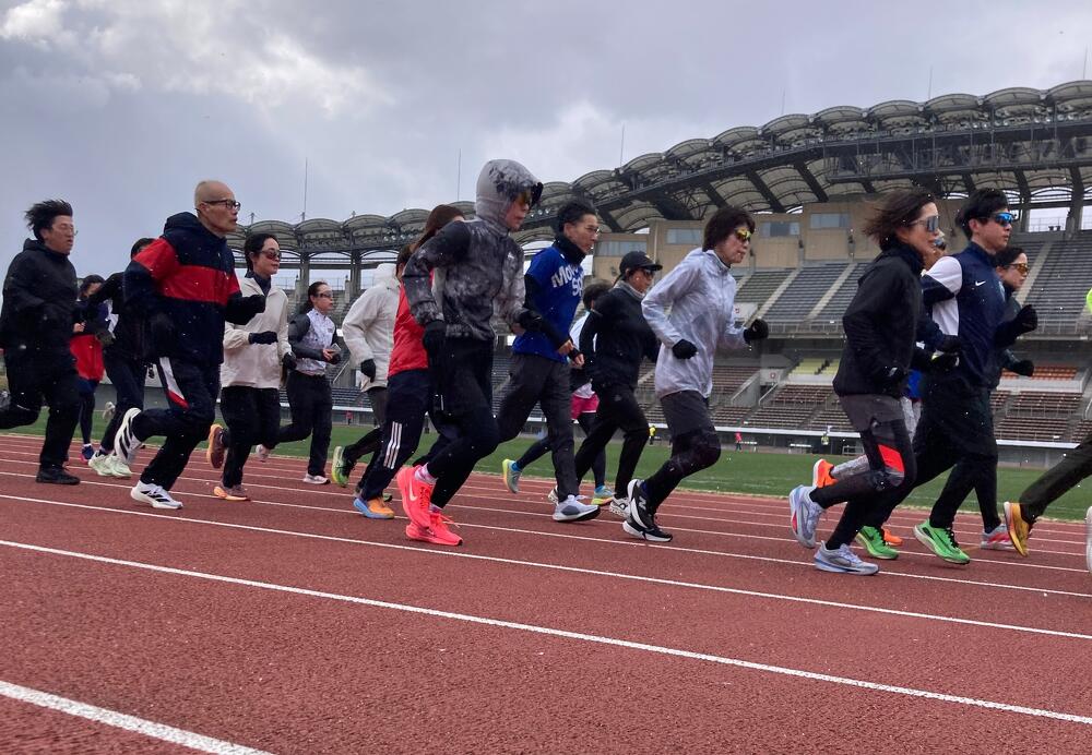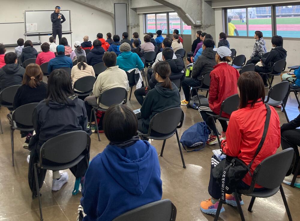 当日の気温は4℃、時折り小雪がチラつく非常に冷え込む中ではありましたが、大会応援サポートコーチの青山剛氏と大会公式ペースランナーなどから、走り方のポイントや練習方法、給水の取り方などレースでのテクニックをレクチャーしていただき、参加者の走力に合わせたペース走や質疑応答タイム、オークリー社製最新スポーツサングラスの試着体験(日本でここだけ)など盛り沢山な内容で、熱心に取り組まれている参加者のみなさんの姿が印象的でした。