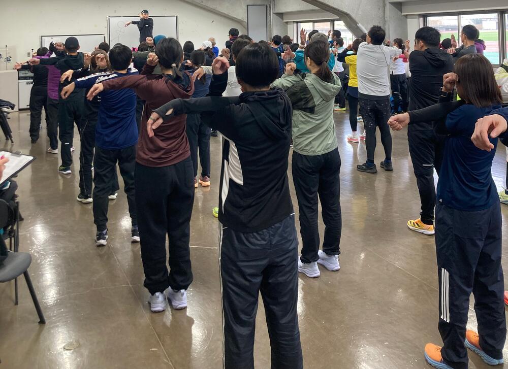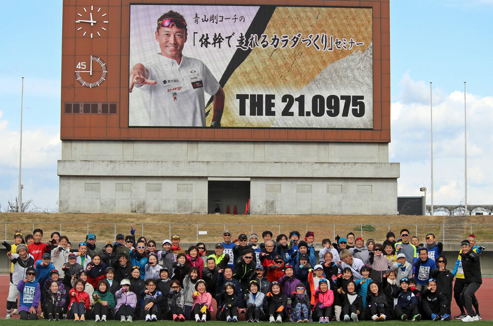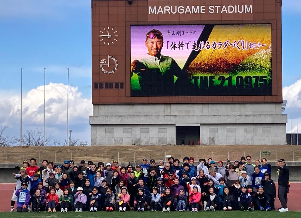 1月11日(日)香川県立丸亀競技場にて、ステップアッププログラム第三弾【香川丸亀国際ハーフマラソン ×かがわマラソン攻略クリニック 】「青山剛コーチの『体幹で走れるカラダづくり』セミナー」が、開催されました!(参加者:65名、丸亀ハーフペースランナー:12名、かがわマラソン2026レースサポーター:20名)