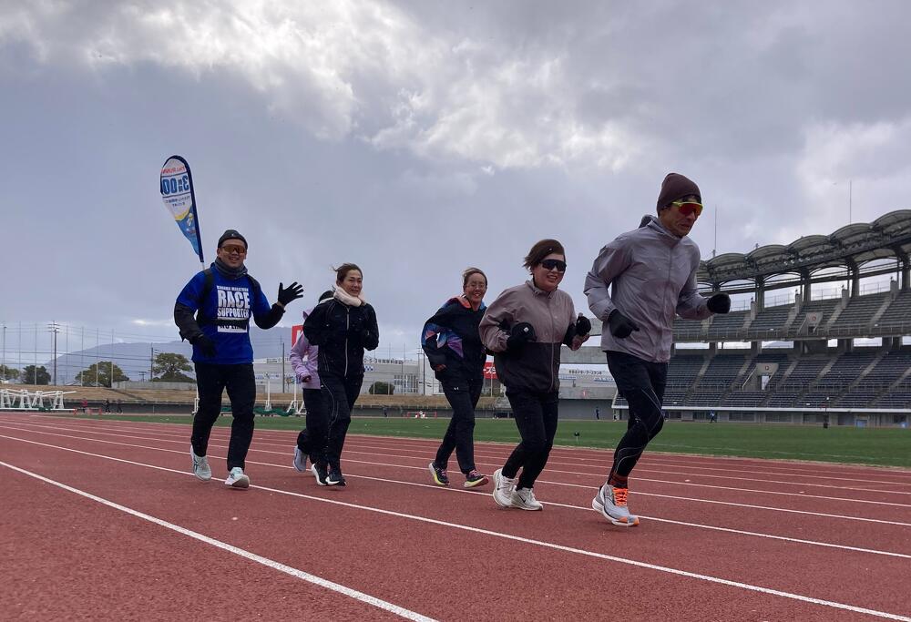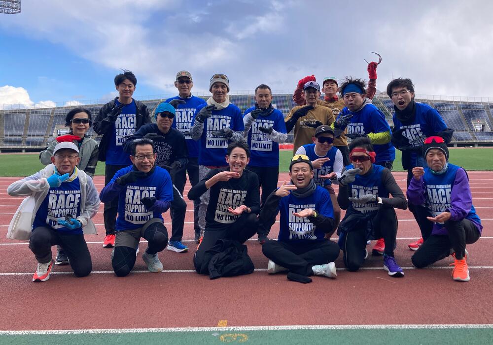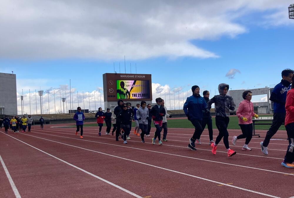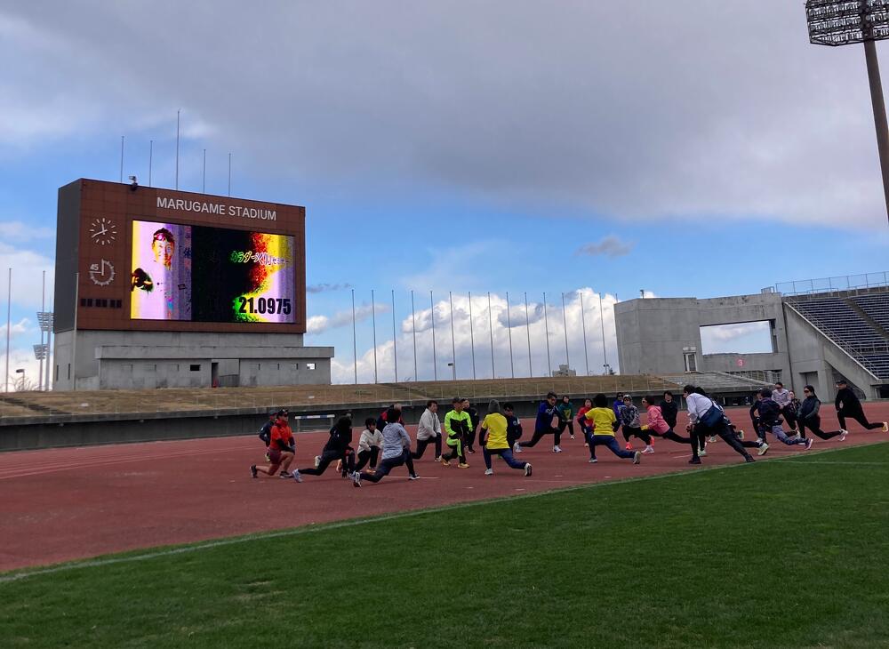 参加者のみなさんからは、「身体の動かし方やストレッチ方法を教えていただき勉強になりました。」「親切にわかりやすく教えてくれました。楽しかったです。」「大会にむけてやる気スイッチが入りました。」などのお声のほか、「ペースランナーの方にレースペースで走っていただき、本番のペースを確認することもできて良かったです。」「丸亀ハーフとかがわマラソンの両方を走るイメージができました。」など大会当日を念頭に熱心に取り組まれていた様子が伺えるお声もあり、とても充実した練習会となりました。