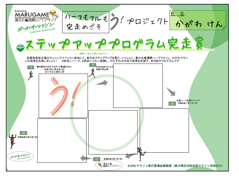各関係団体主催のランニングイベントに参加して、走力のステップアップを図り、いっしょに、香川丸亀国際ハーフマラソン、かがわマラソンの完走を目指しましょう!