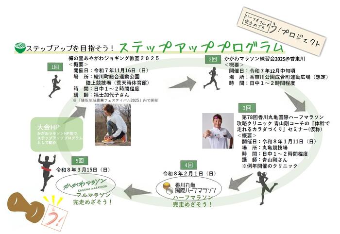 全5回のステップアッププログラムは、「ハーフもフルも完走めざそう!プロジェクト」のひとつ。4回目にハーフ、5回目にフルに挑戦し、それぞれの大会で完走を目指します。
