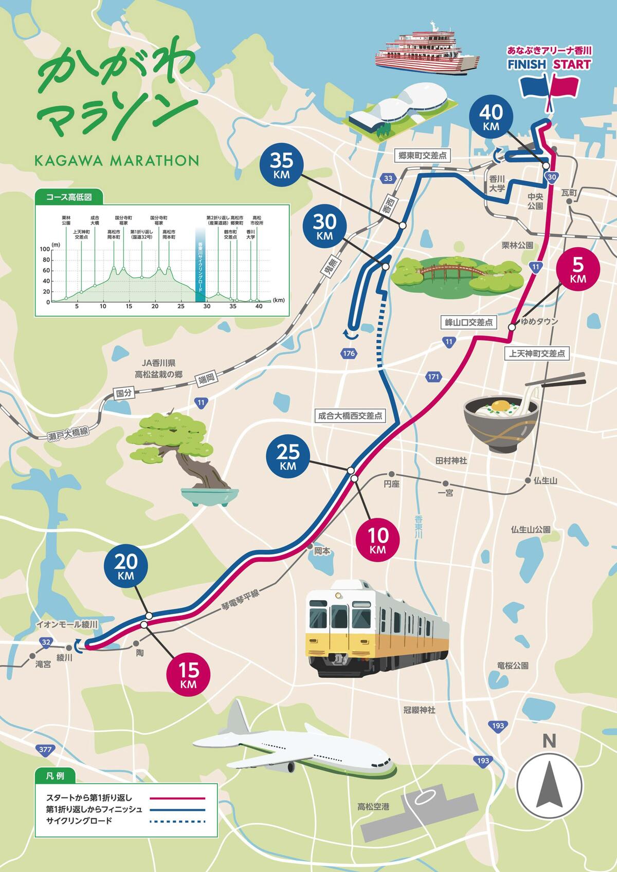 マラソンのスタートフィニッシュ会場であるあなぶきアリーナ香川を発着とした、