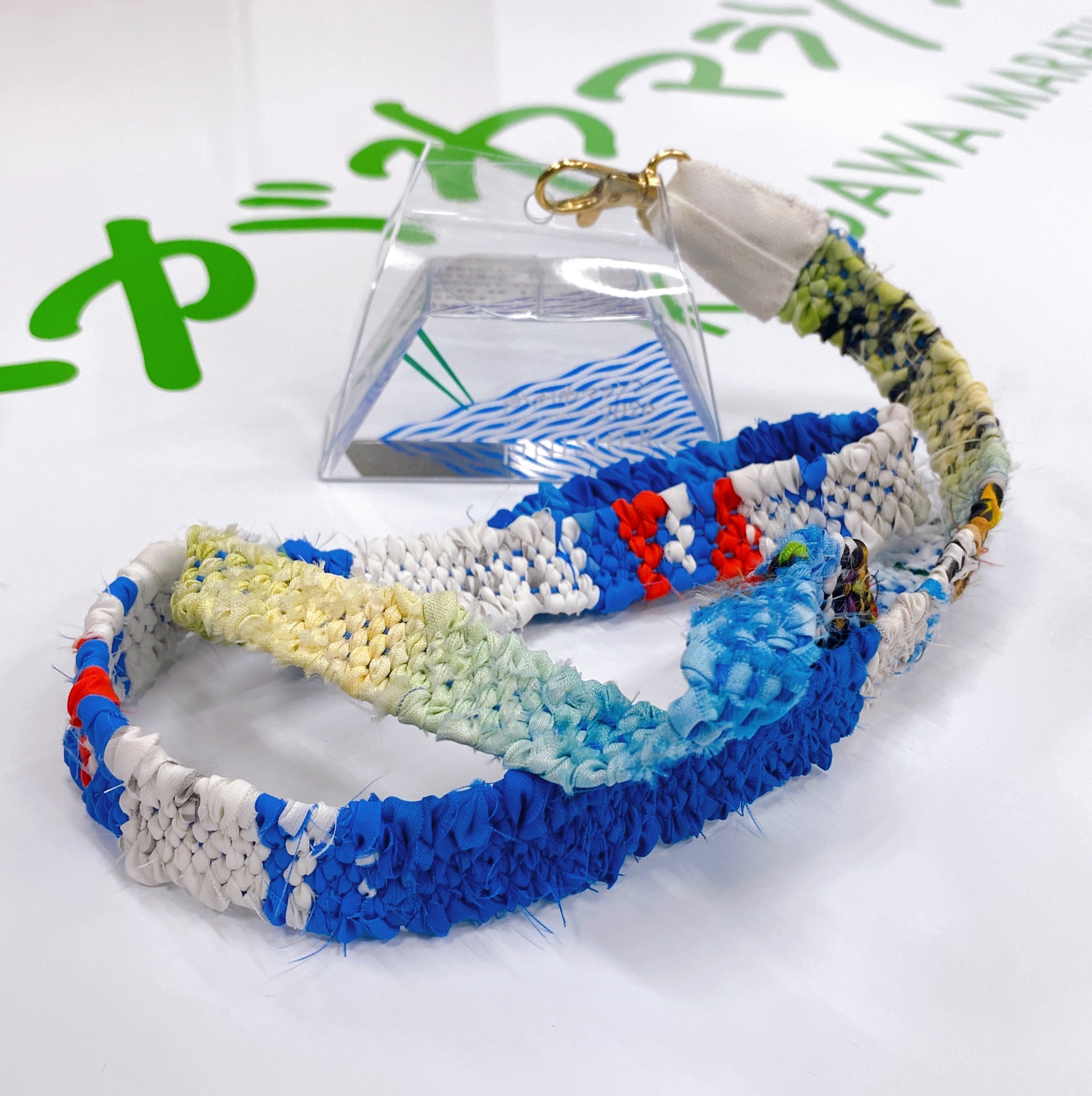 このメダルリボンは入賞者用と同様、廃棄予定ののぼり旗のアップサイクルで、就労継続支援B型事業所「咲く屋」の織り作家さんによる手織りの1点もの。織りあげたリボンを縫い留める布地も、のぼりの「チチ」をリユースするなど、のぼり旗をフル活用した、サステナブルな大会を目指すかがわマラソンのシンボリックな公式グッズ。