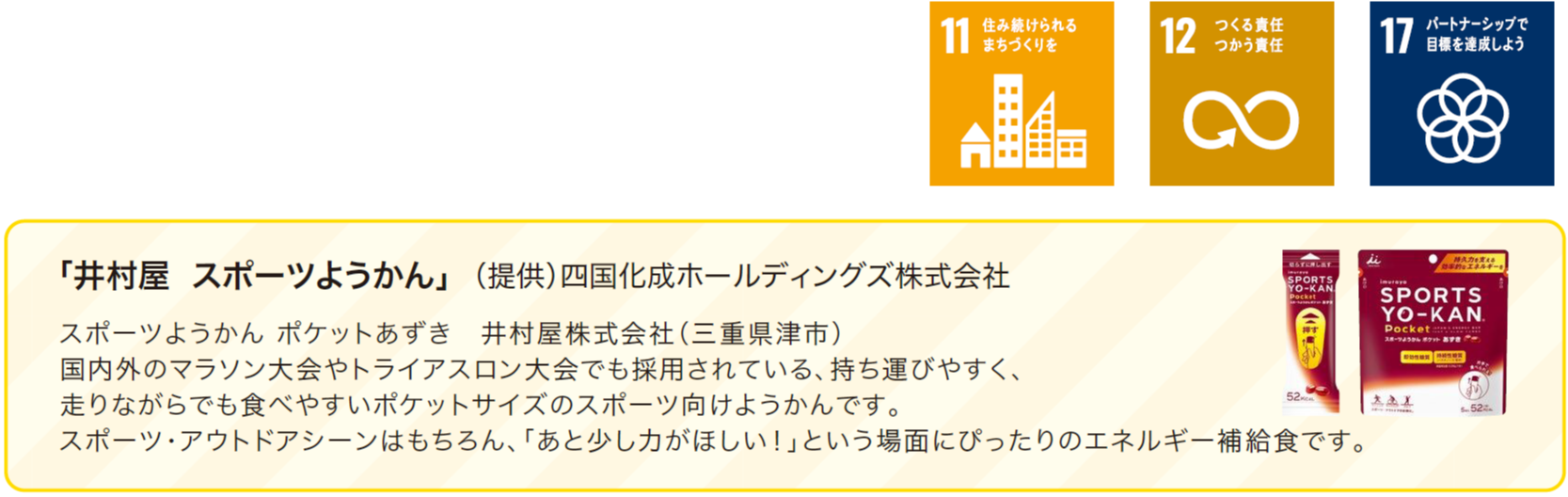 香川丸亀国際ハーフマラソン大会でエイドとして提供された「スポーツようかんポケットあずき」の余剰分を四国化成ホールディングズ株式会社より譲り受け、かがわマラソンでもご提供いたします。香川県内の大会で連携し、一丸となって食品ロスを減らす取組みです。